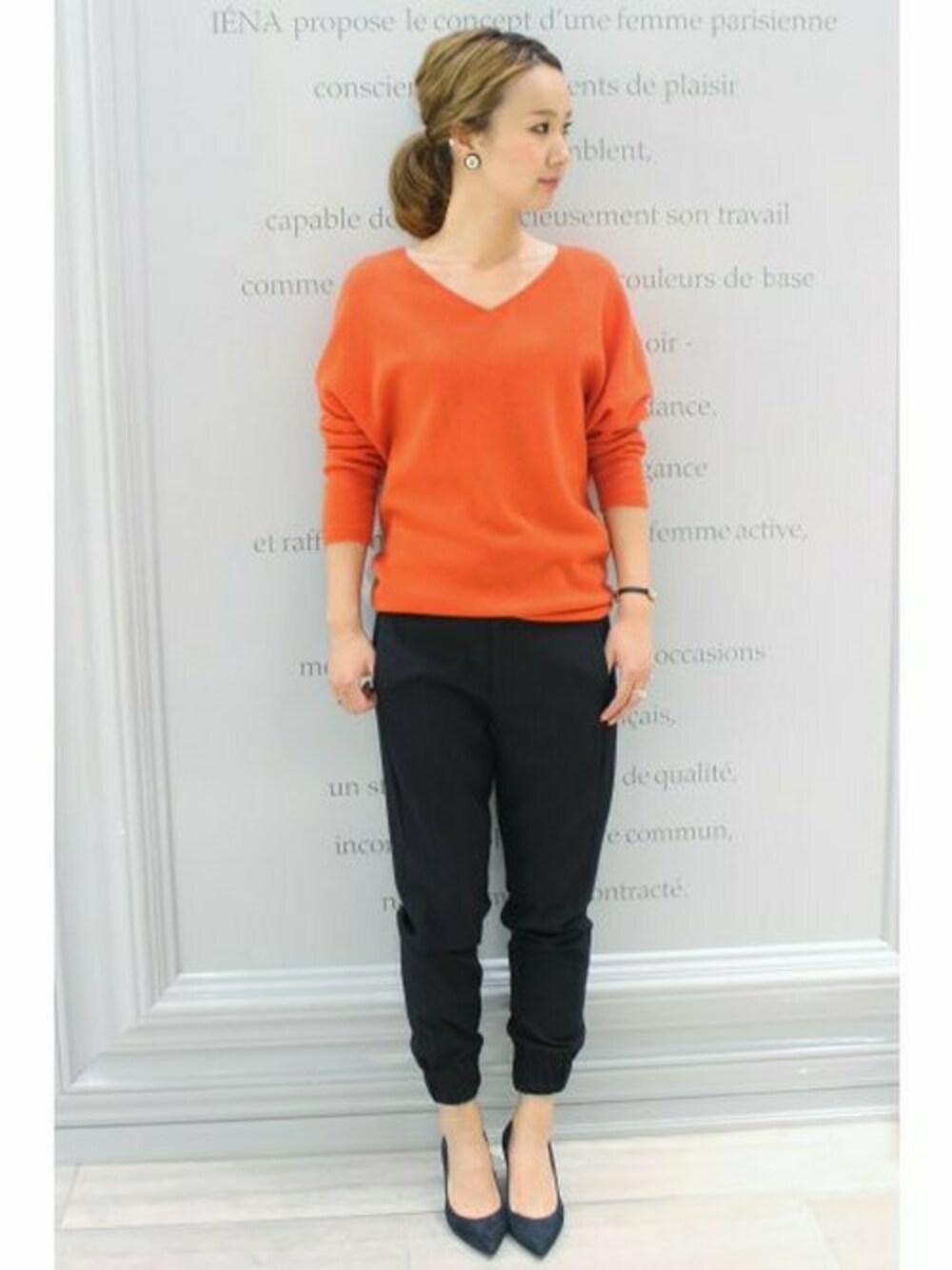 Vネックニットは定番の形だからこそ発色のきれいな色を選んで♪ 裾ゴムデザインのパンツとパンプスで大人な印象に