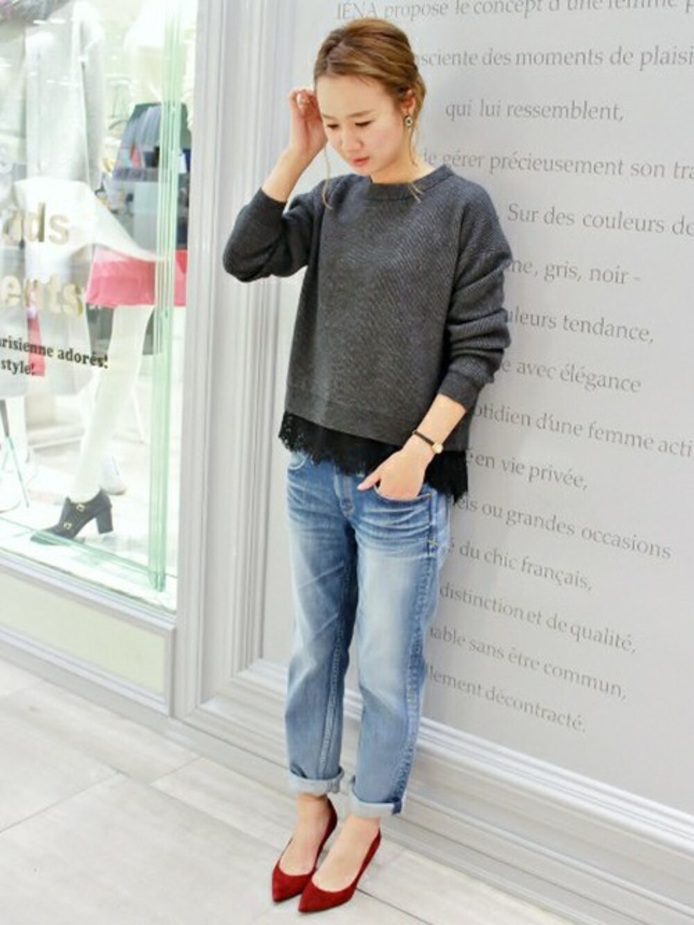 甘いレースも大人なグレーでシックなアイテムに。 足元は赤で差し色を。