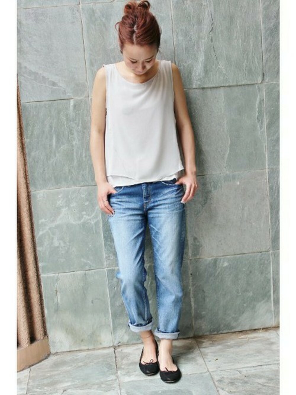 レイヤードトップスコーディネート。 シフォン素材のレイヤードデザインがポイントのトップス。 OFFの日はデニムでカジュアルに♪