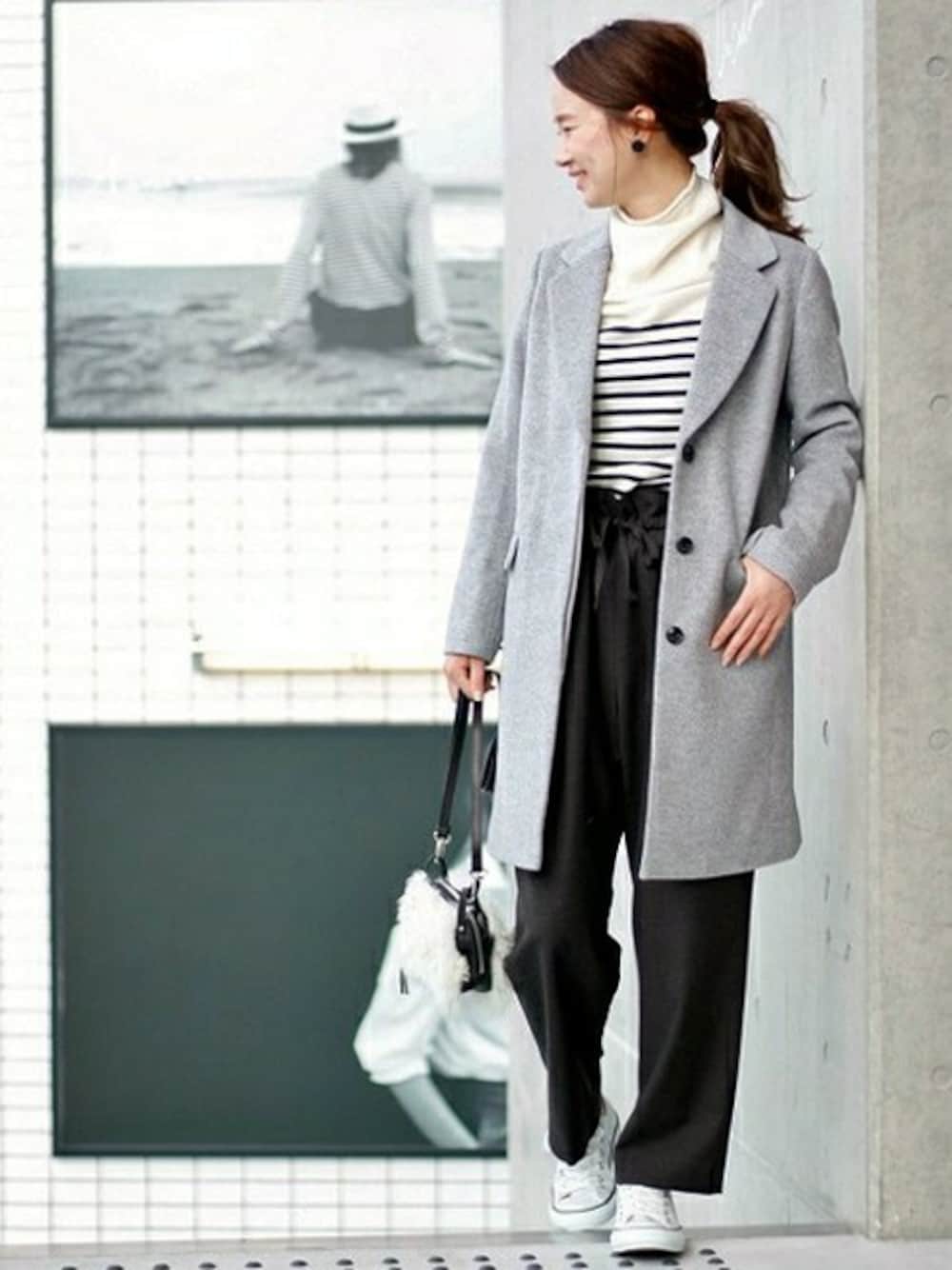 カジュアルなコーディネートにも、大人っぽく上品に合わせらるグレー。 足元はスニーカーで抜け感を♪