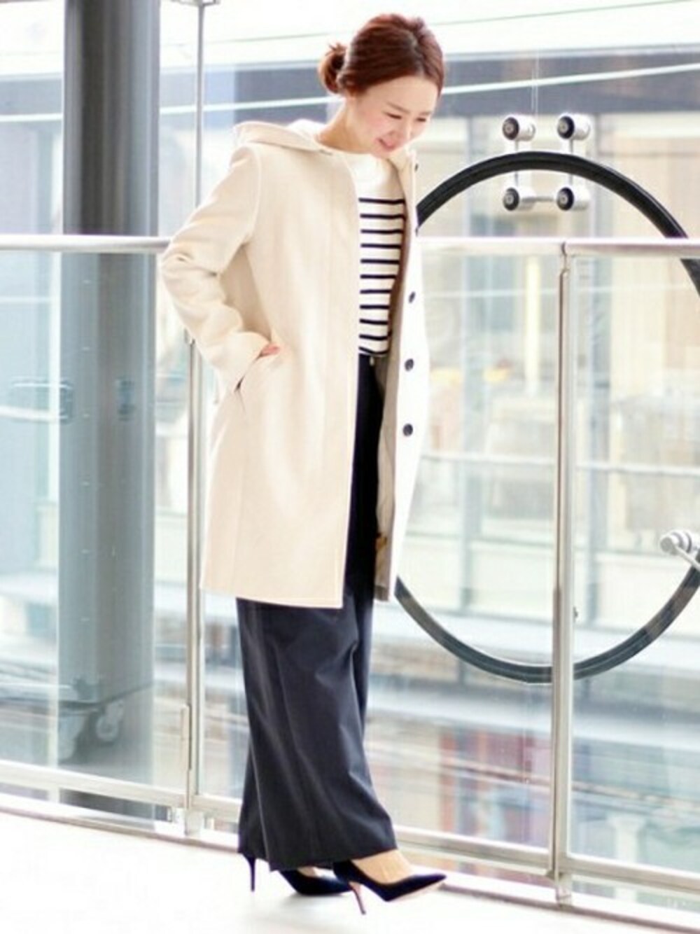 毎年人気のフードコート。 とろみのあるワイドパンツで。 フードを外して印象をかえることができます。