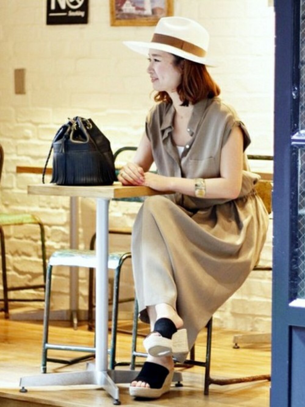 【CLASSY×IENAコラボレーションワンピース】 辛口なかっこいいスタイリングがお好きな方には、カーキがおすすめ。 ブラックの小物やハットをあわせて、こなれ感を出して。