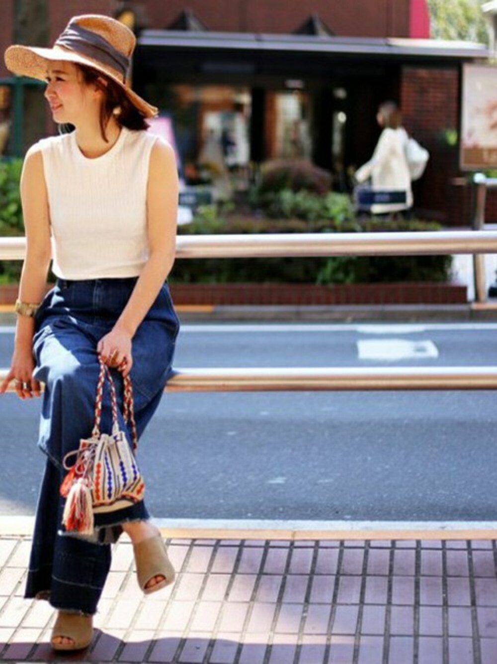 首元の開き・リブの太さが人気の【young&olsen】 合わせる小物でボリュームを。 お気に入りの巾着バッグはコーディネートのキーに。