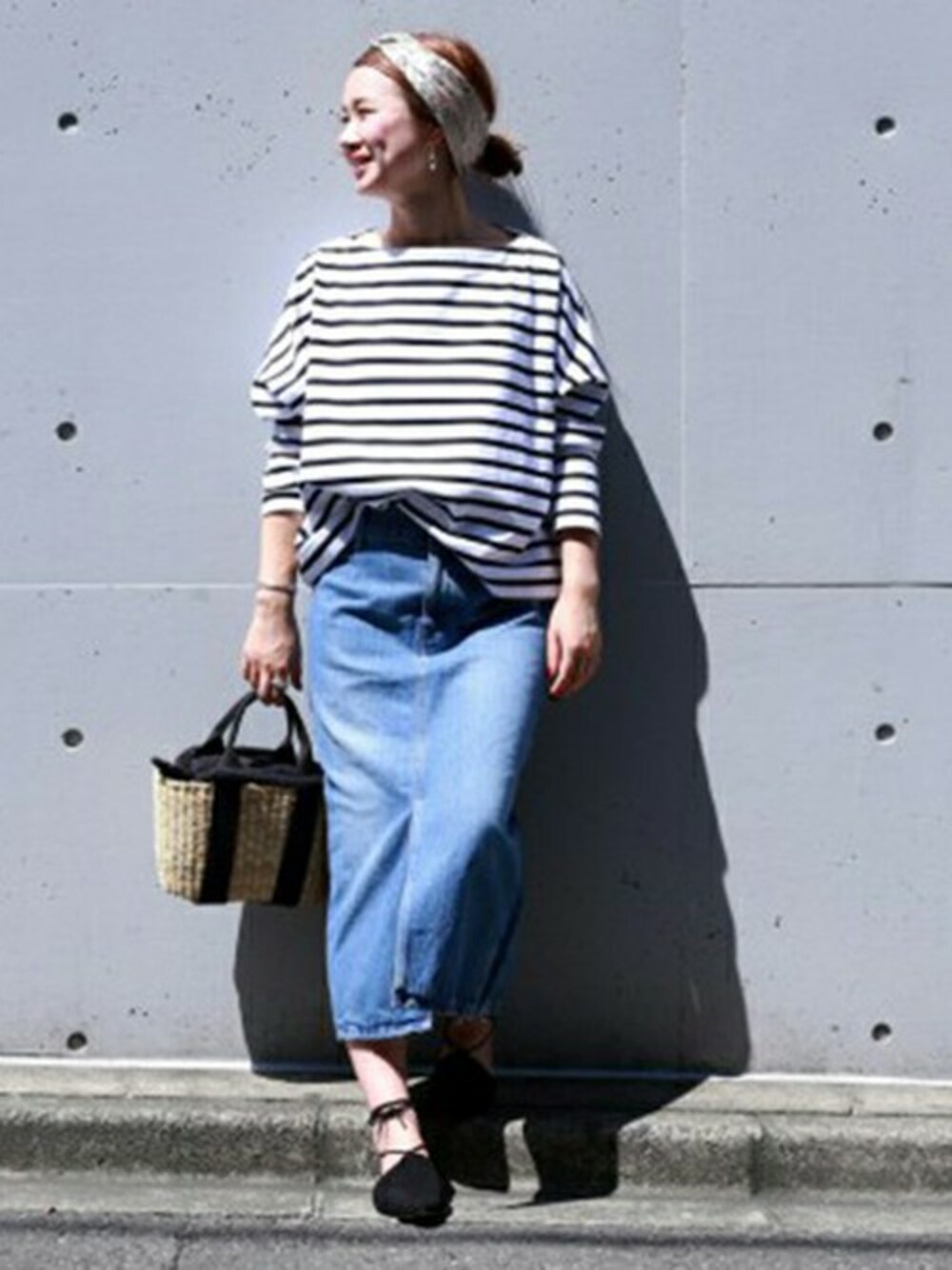 ボーダー×デニムスカート 定番コーデはスカーフやBAGでアクセントを。