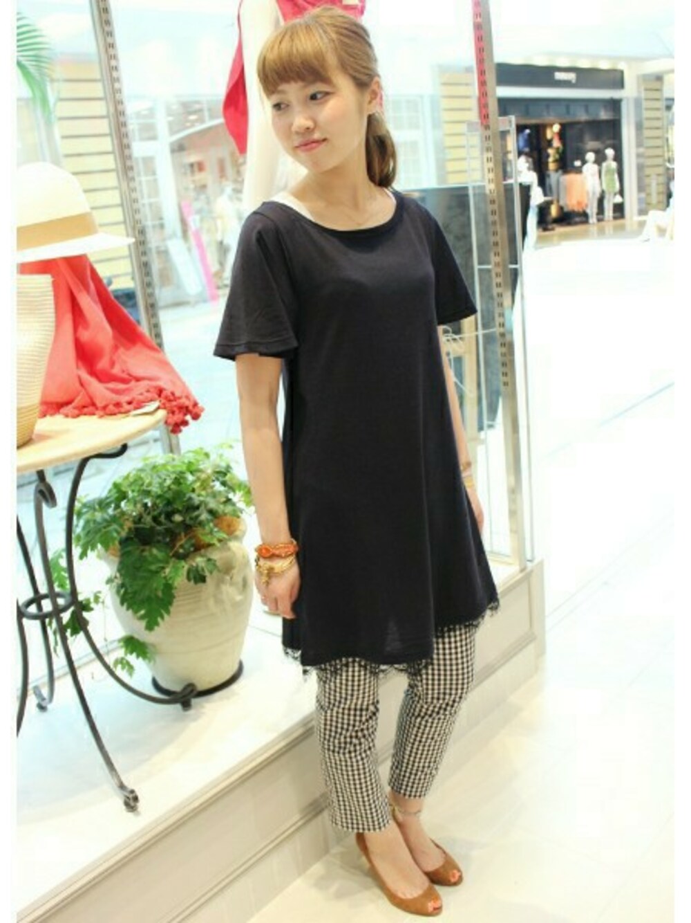 裾からさりげなくのぞくレースが胸きゅん♪ ギンガムチェックのパンツとあわせて、着こなしにメリハリ感をプラス☆
