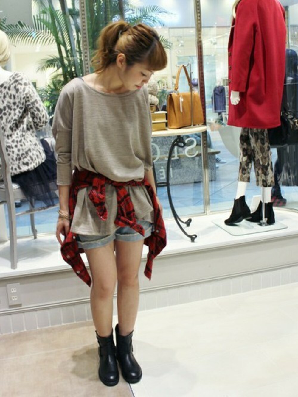 チェックシャツを腰巻きにして、こなれ感を演出。 トレンドのチェック柄は絶対にはずせませんね!