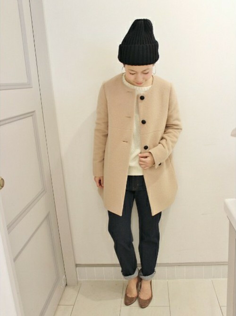 上品なノーカラーコートをニットキャップではずしでみました。 ボタンと帽子のカラーを揃えるのがポイントです♪