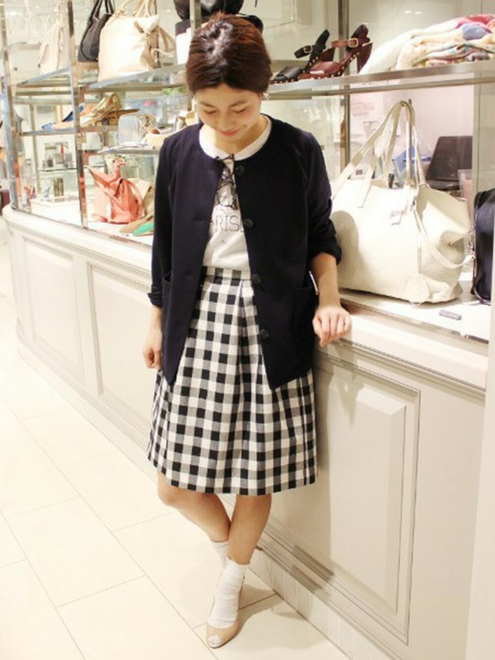 今年らしいひざ丈スカートはギンガムチェックで季節感をプラス♪ ポンチジャケットはカーディガン感覚でさらっと羽織ってOK