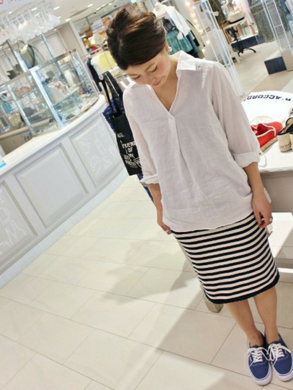 タイトスカートはロングトップスとも相性抜群! リネンシャツで季節を感じて♪