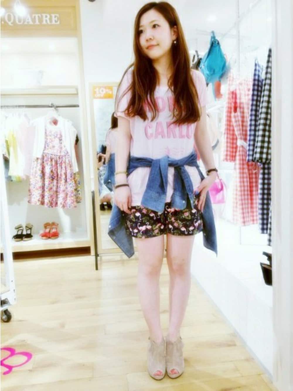 ★夏到来!フラミンゴ柄ショートパンツでコーデ★ 夏といえば・・・フラミンゴ! シンプルなロゴTシャツと合わせて、柄のパンツが大人っぽく使えるコーディネートです♪