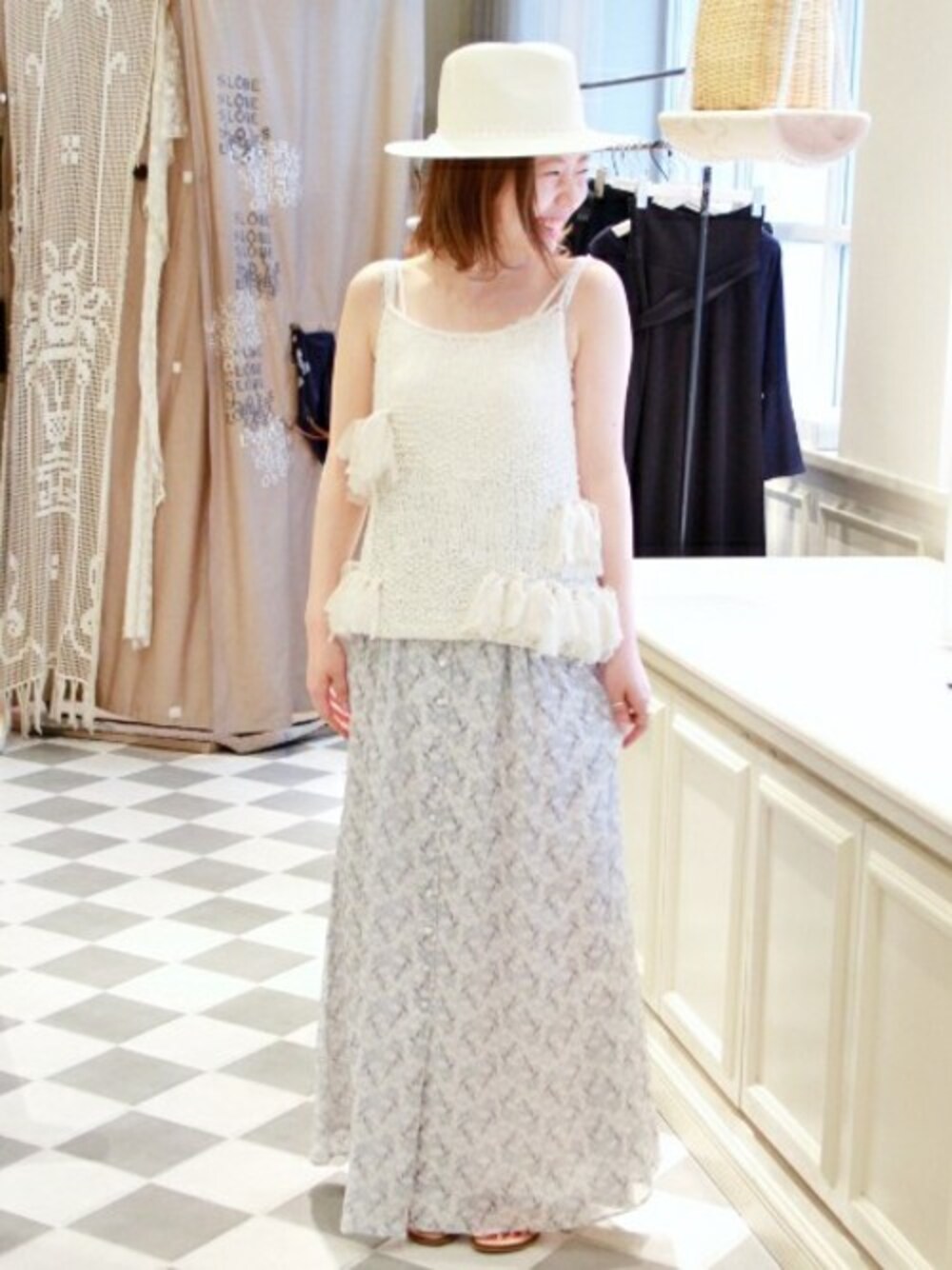 今年らしいレイヤードスタイルは、ニュアンスカラーで一体感を演出。 マキシ丈だからこそ、肌みせもヘルシーな印象に。