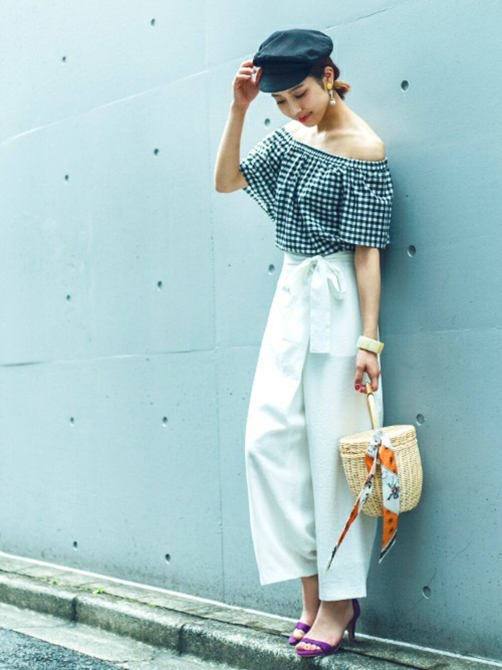 オフショルダーブラウスはヘルシーな肌みせを叶えてくれる優秀アイテム!ホワイトパンツと合わせて爽やかなマリンスタイルに。