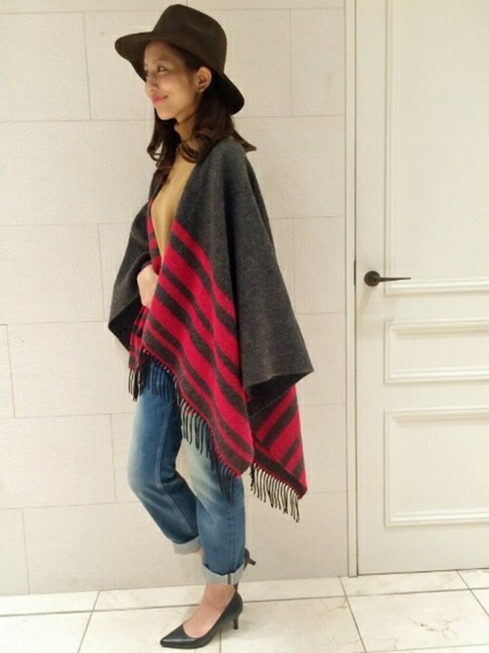 ベーシックアイテムのデニムと今季トレンドのフリンジポンチョを合わせたMIXコーディネート。 キーカラーはポンチョのREDです!