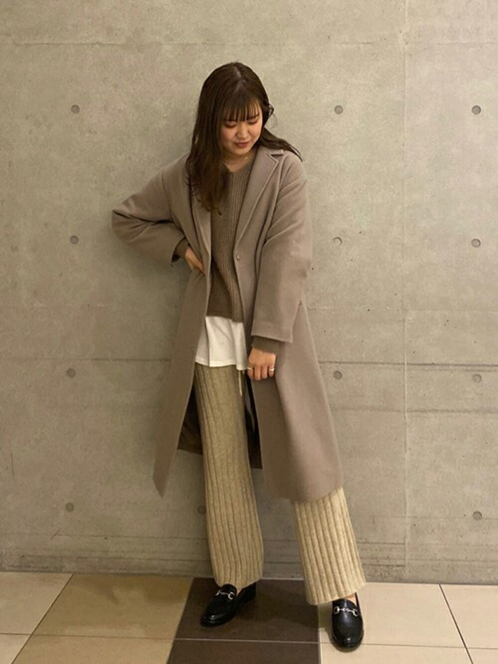 ◆SUPER100チェスターコート ベーシックなチェスターコートは、合わせるお洋服を選ばずお使いいただけます! 淡色ベージュでワントーンコーデにしてみました^ ^ ニット×ニットでリラックス感ですぎないよう、カットソーをレイヤードしたり、ローファーを取り入れてメリハリをつけました! ********************** 年齢:20代前半/身長:167cm/体型:高身長/普段サイズ:M〜L/着用サイズ:38 サイズ感:足首までしっかり丈があります。 素材感:ウール100%の暖かいお素材。 着心地:裏地がしっかりついているので袖通りもいいです。 **********************