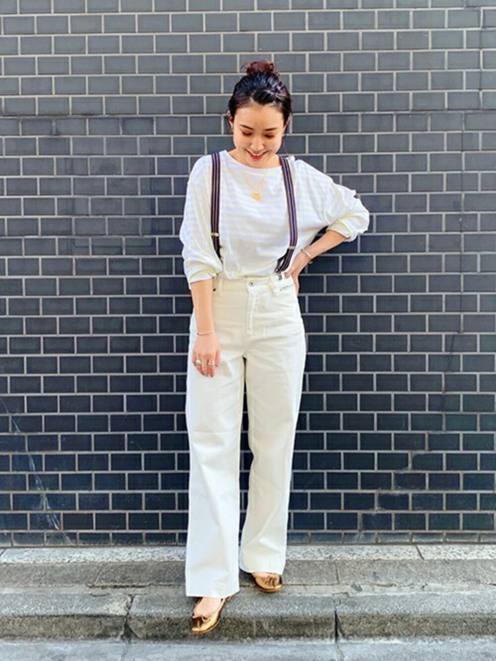 ◆ 《追加2》LE DENIM バギーパンツ これからの季節一枚は欲しいホワイトのパンツを、マニッシュ風にコーディネートしてみました。 ********************* 年齢:20代前半/身長:159cm/体型:厚みのあるストレートタイプ/普段サイズ:38/着用サイズ:40 サイズ感:ゆったり履きたくて今回普段よりワンサイズアップしました。ぎりぎり引きづらない丈感です。 素材感:硬すぎず、柔らかすぎず、程よいパリッと感です。 着心地:素材感が丁度よく、形が綺麗に出て、着初めから履き心地がよいです◎軽めなハイウエストで腰回りマークしてくれるのも、脚長効果が出ます♪ *********************