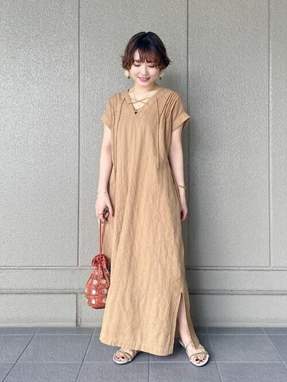 【ストライプカフタンワンピース】 〈着用サイズ :フリー〉 表面感があり一枚で着映えするワンピースです。 細かい部分のデザインが魅力的です♪ ゆるっとしたシルエットで、身体のラインを拾わないのも嬉しいポイントです◎ また、二の腕をカバーしてくれる袖丈です。 足の甲にかかるぐらいの着丈で、フラットシューズでも床に着かない丈でした。 胸元はレースアップや足元のスリットで、抜け感が出ます♪ さらっと一枚で着てみました◎ アクセサリーやサンダルをゴールドでまとめて、 統一感を出しました。 ※ピアスは私物です。 【Instagram】⇒@24aaai___ 低身長を生かしたコーディネート等を提案しています♪よろしければフォローよろしくお願い致します。