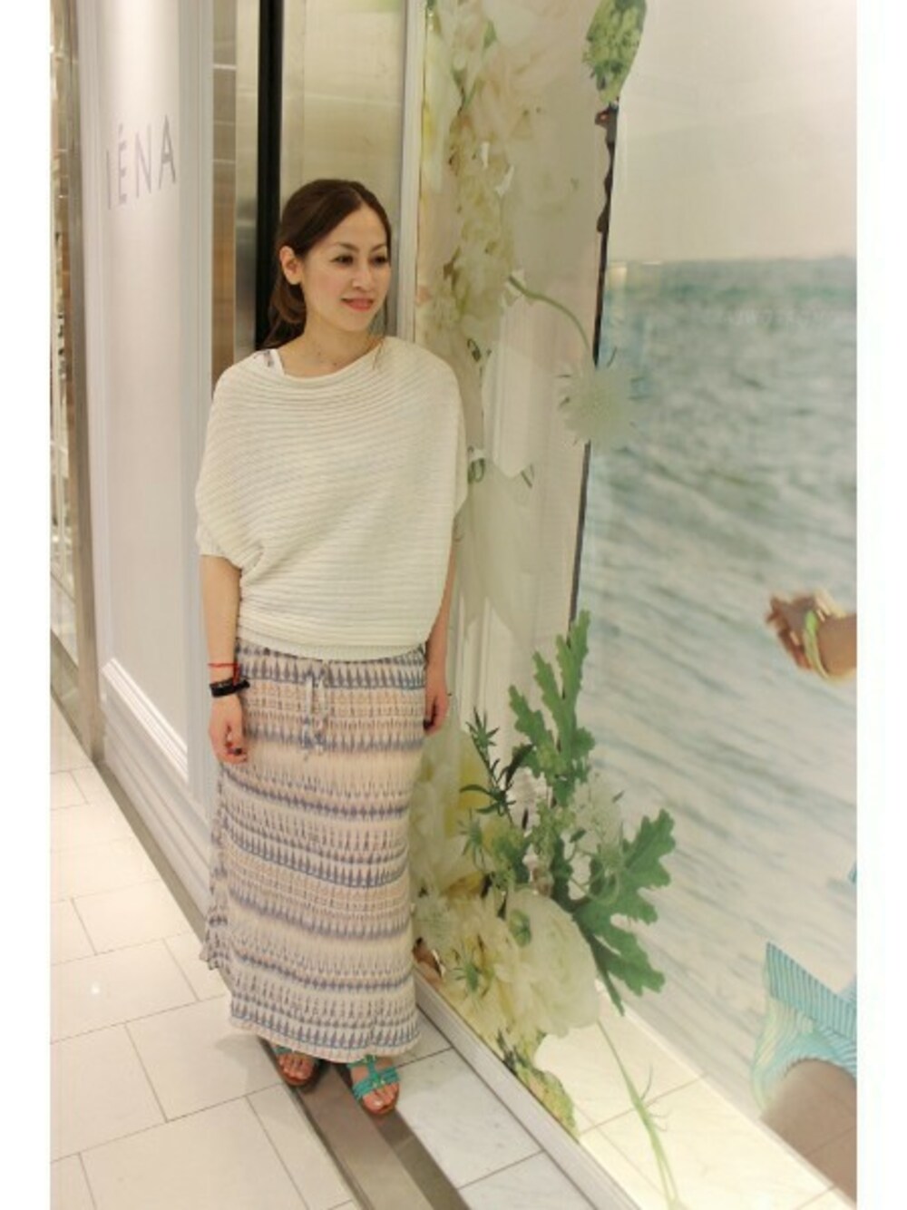 さらっとした素材感が大人っぽいおすすめのドルマンニットです お仕事にも、カジュアルにも意外と幅広く着こなせます プリントワンピースで少しリゾート向きに着こなしました