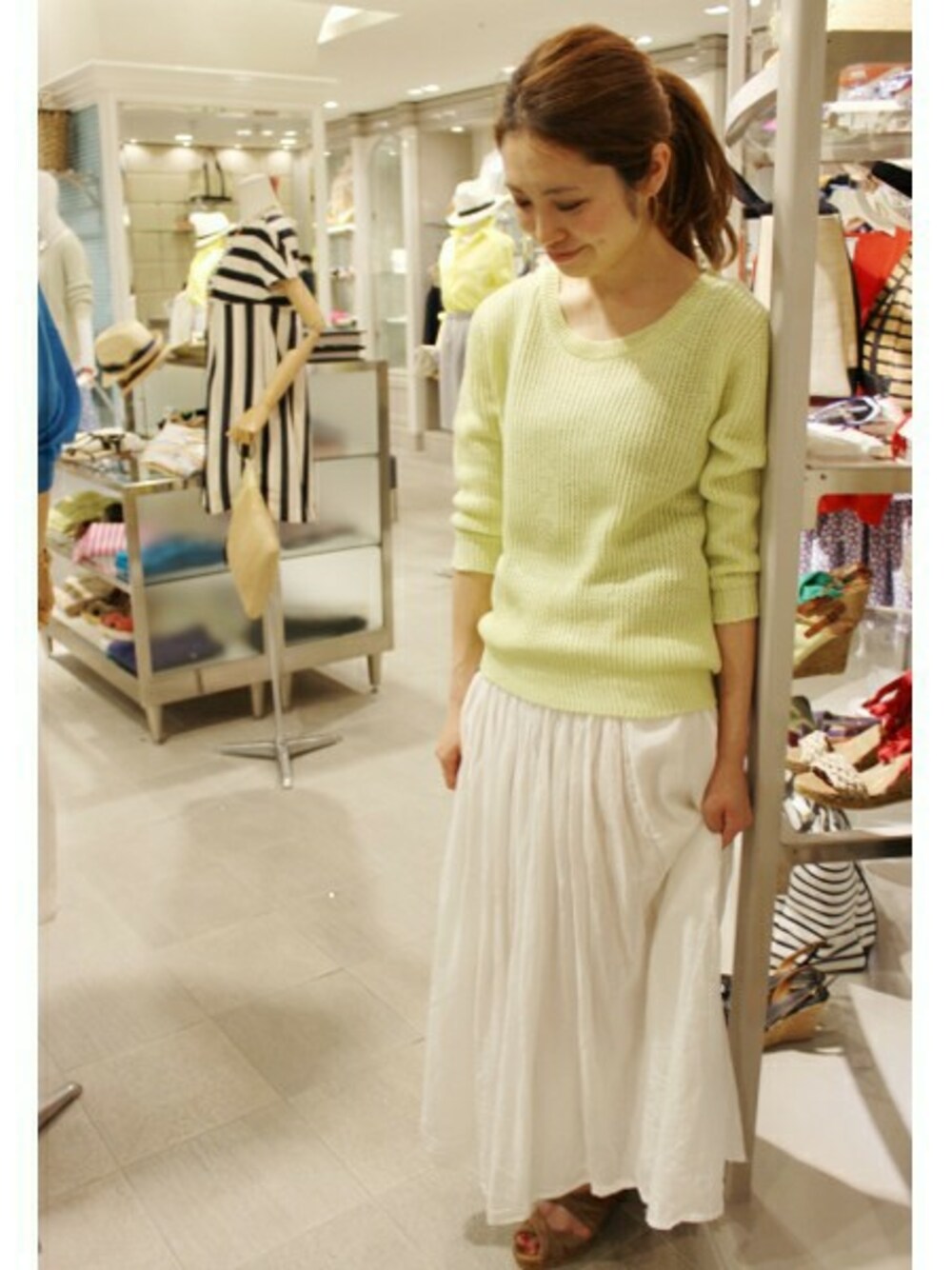 まだまだ大人気のカラーニット リネンのマキシスカートで軽やかな夏スタイルに着こなしました