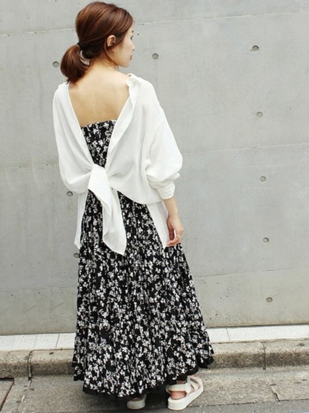 シンプルなシャツはシャツの着方を覆し、前後を逆にした着こなし。 裾をきゅっと結んで。