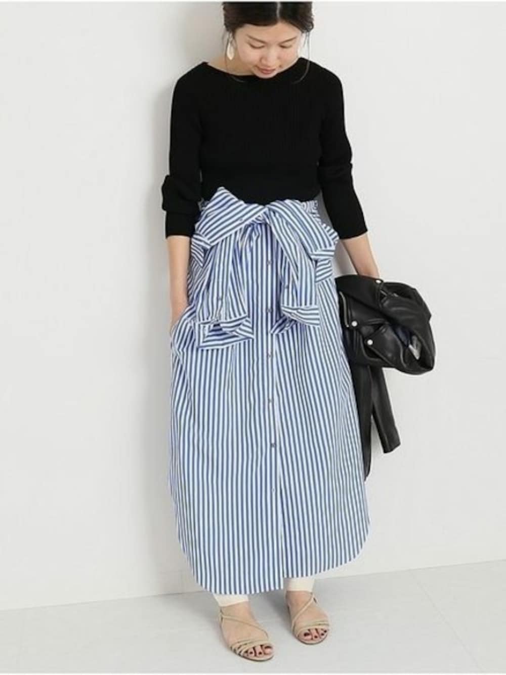 シャツワンピ腰巻にしてロングスカート風に。 レギンスと合わせたトレンド感あるスタイルです。