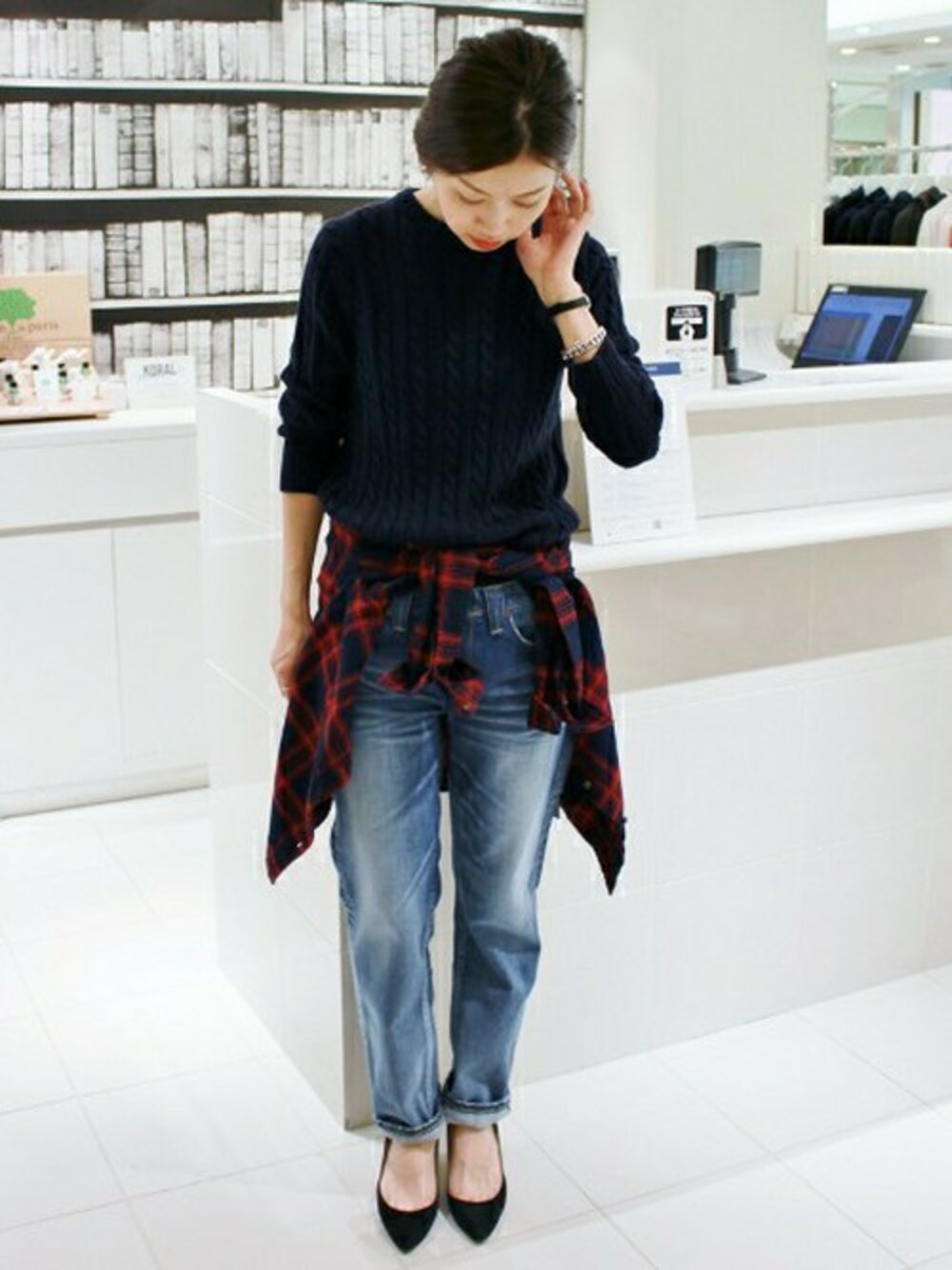 絶妙なゆるみのあるニットとパンツのサイズ感… 腰巻にしたシャツでこなれた雰囲気に。 足元をパンプスであわせたのも女っぽく着こなすポイント