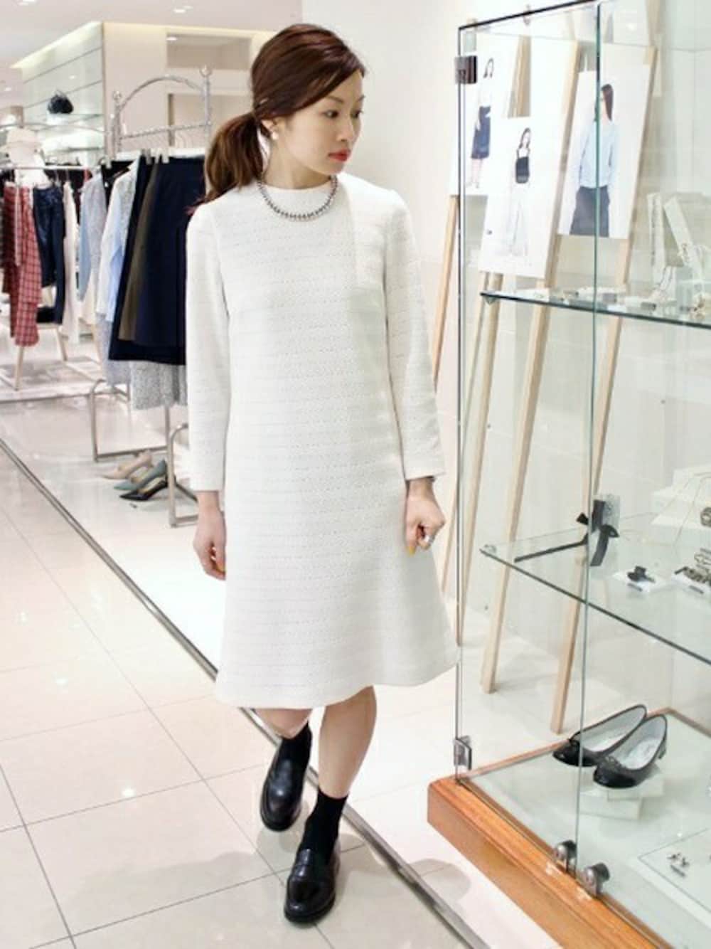 きれいなラインが特徴的のワンピースできれいめコーディネート 足元は、ソックス+ローファーで今年らしく☆