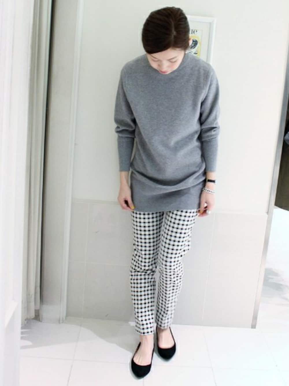 グレーのニットとチェックのスティックパンツで洗練されたカジュアルコーディネート