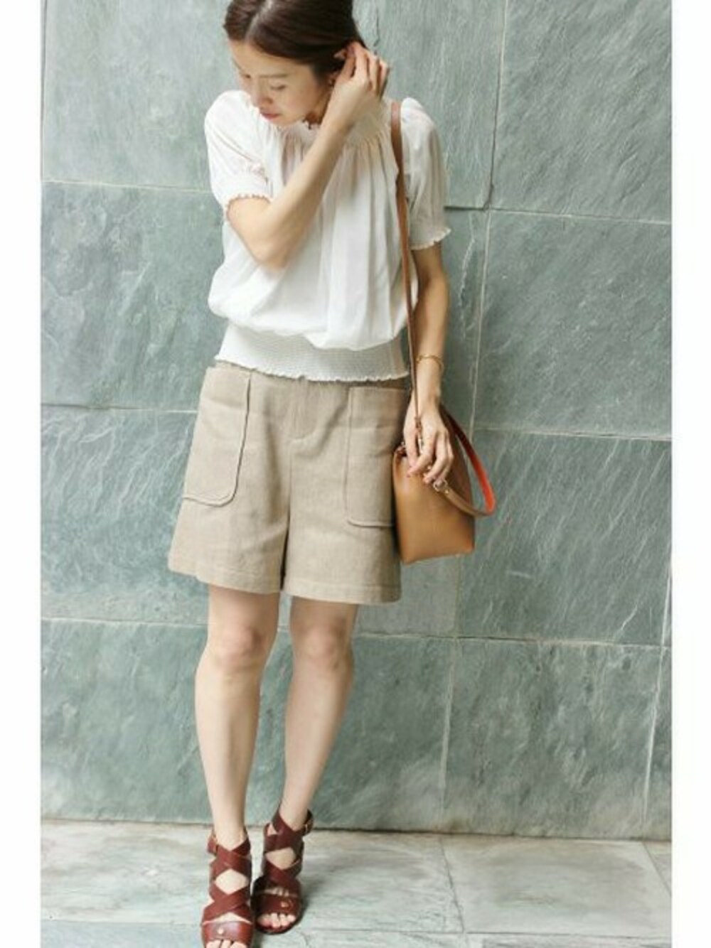 ふんわりギャザーがかわいいブラウスです! ショートパンツで軽快に。