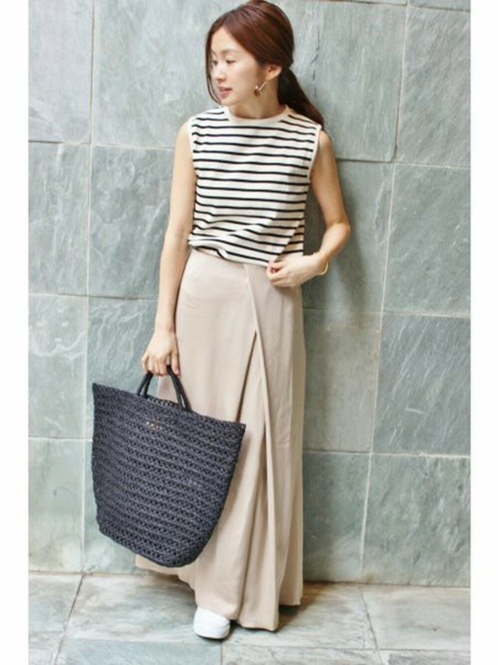 重くなりがちなロングスカートも、ベージュのサテン素材なら軽快に! ボーダーとカゴBAGでアクセントを★