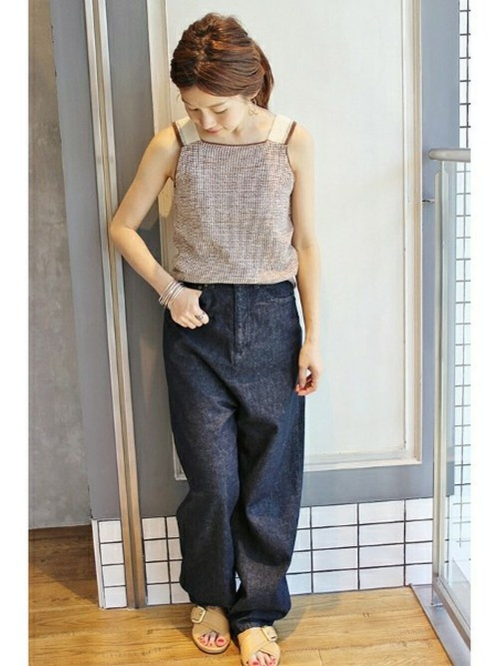 バイカラーメッシュタンク キャミソールライクなコンパクトなトップスと、ハイウエストのワイドパンツで今年らしいバランスのコーディネートです。