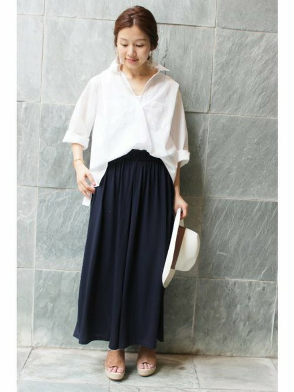 スカートのように見えるボリュームパンツ。 さらっとした綿素材のスキッパーパーシャツを羽織って真夏の紫外線防止にも◎