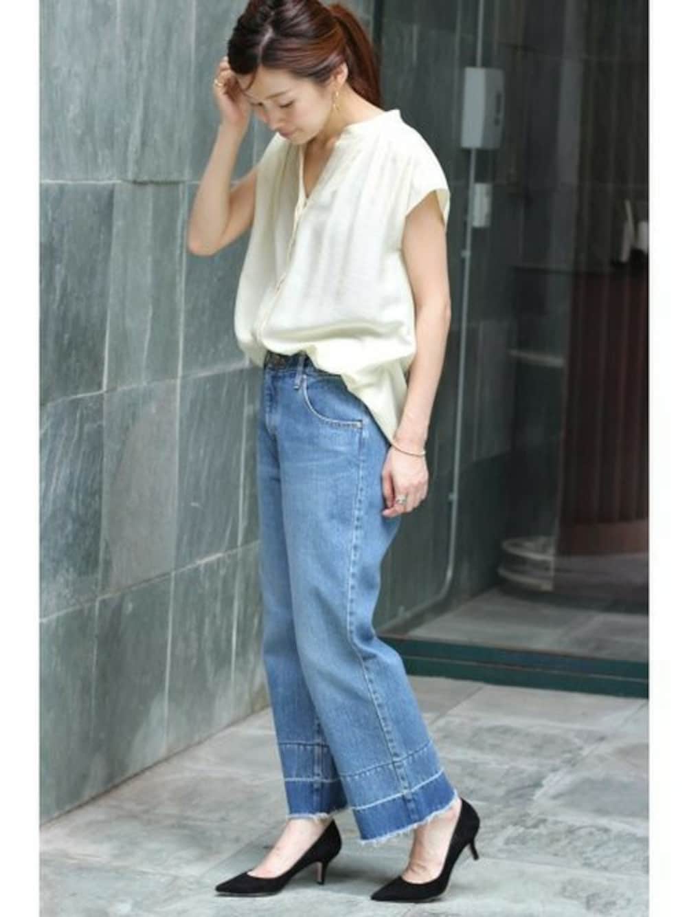 さらっとした素材が着やすいブラウス。 柔らかいきれい色味で初夏らしいスタイリングに。 デニム合わせでカジュアルにも◎