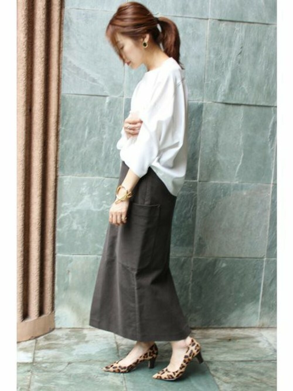 コクーンTブラウス フォルムのバランスが今年らしいスタイリングは、カラーを控えめに。 レオパード柄のパンプスがアクセントです。