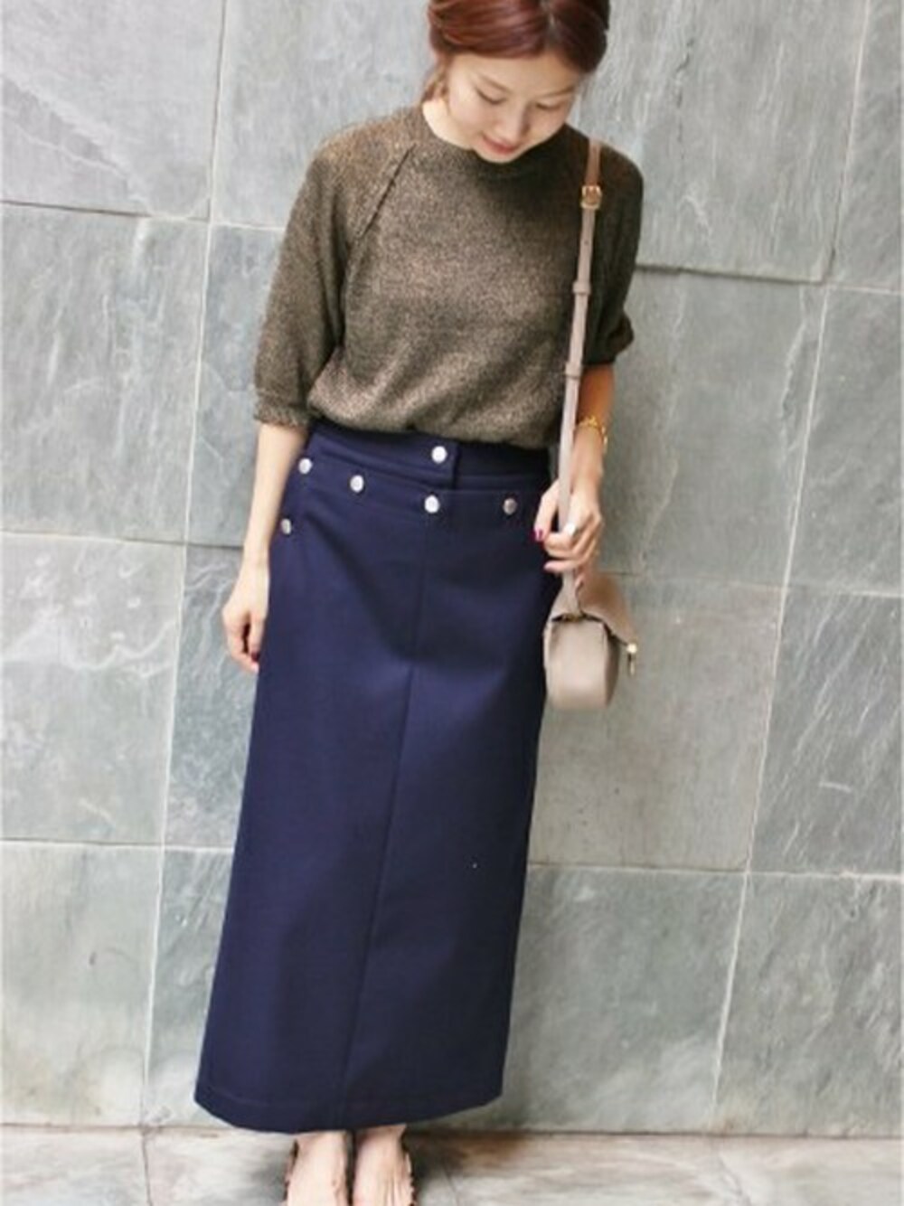 ブラウン×ネイビー コンパクトニットにロングスカートであわせた大人カジュアルコーデ。 足元のレオパードパンプスでトレンドライクに。
