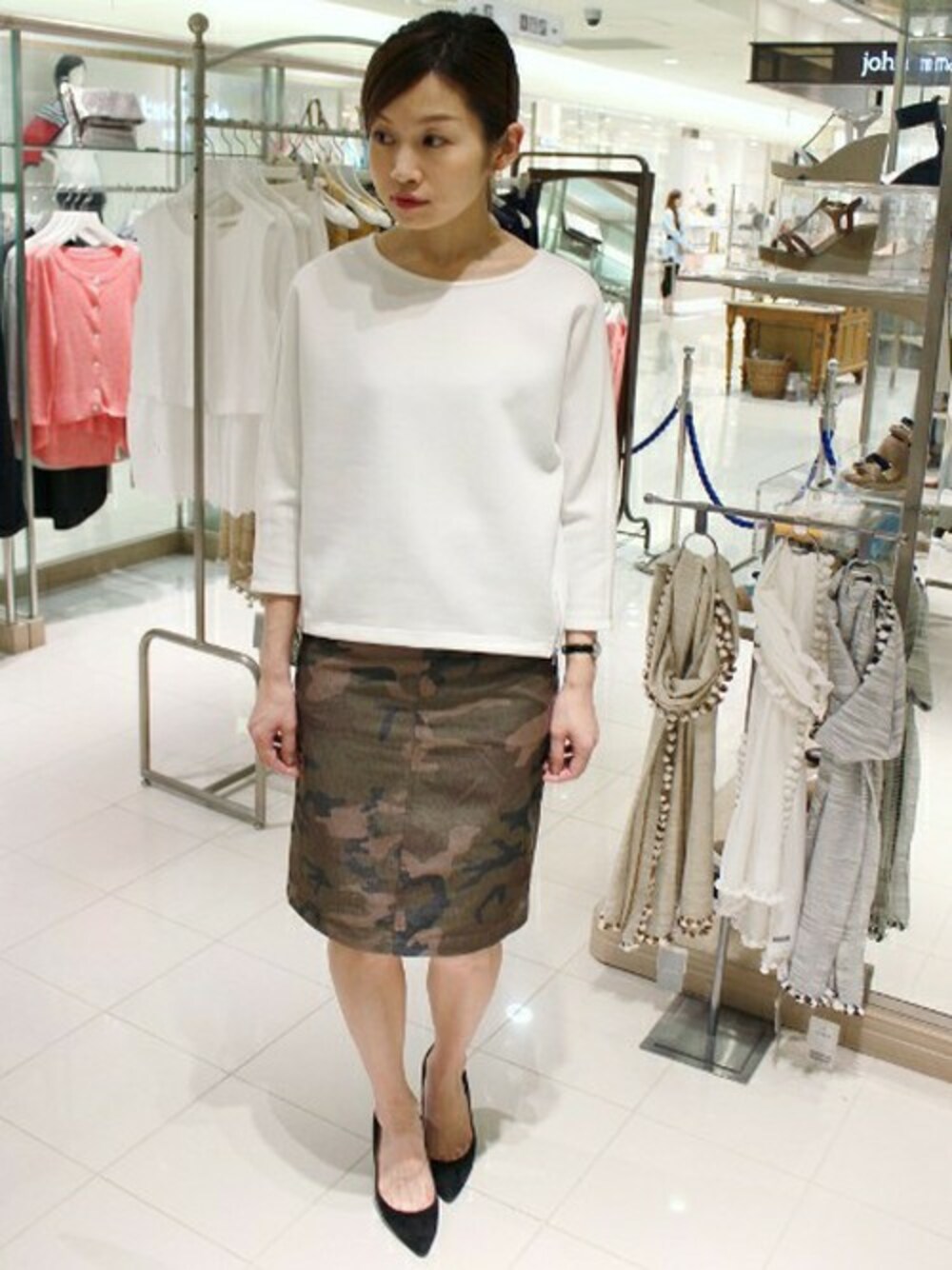 トレンドのカモフラはタイトスカートで取り入れて♪ 大人シックなコーディネートの完成です。