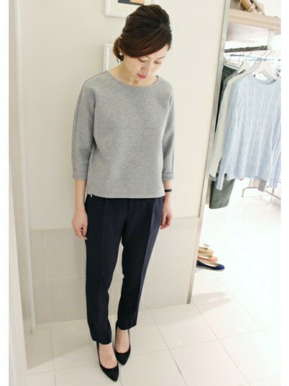 トレンドのスウェットトップスを大人めに着ました。 シックなカラーにパンプスで♪