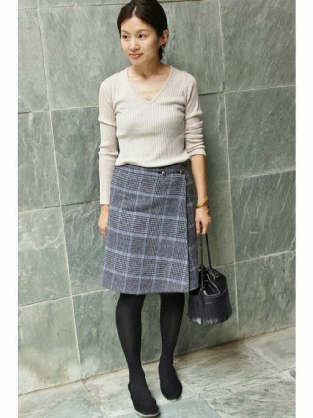 リブニット×チェックスカート IENA定番スタイリング。 今シーズンはVネックで女性らしく着こなして。