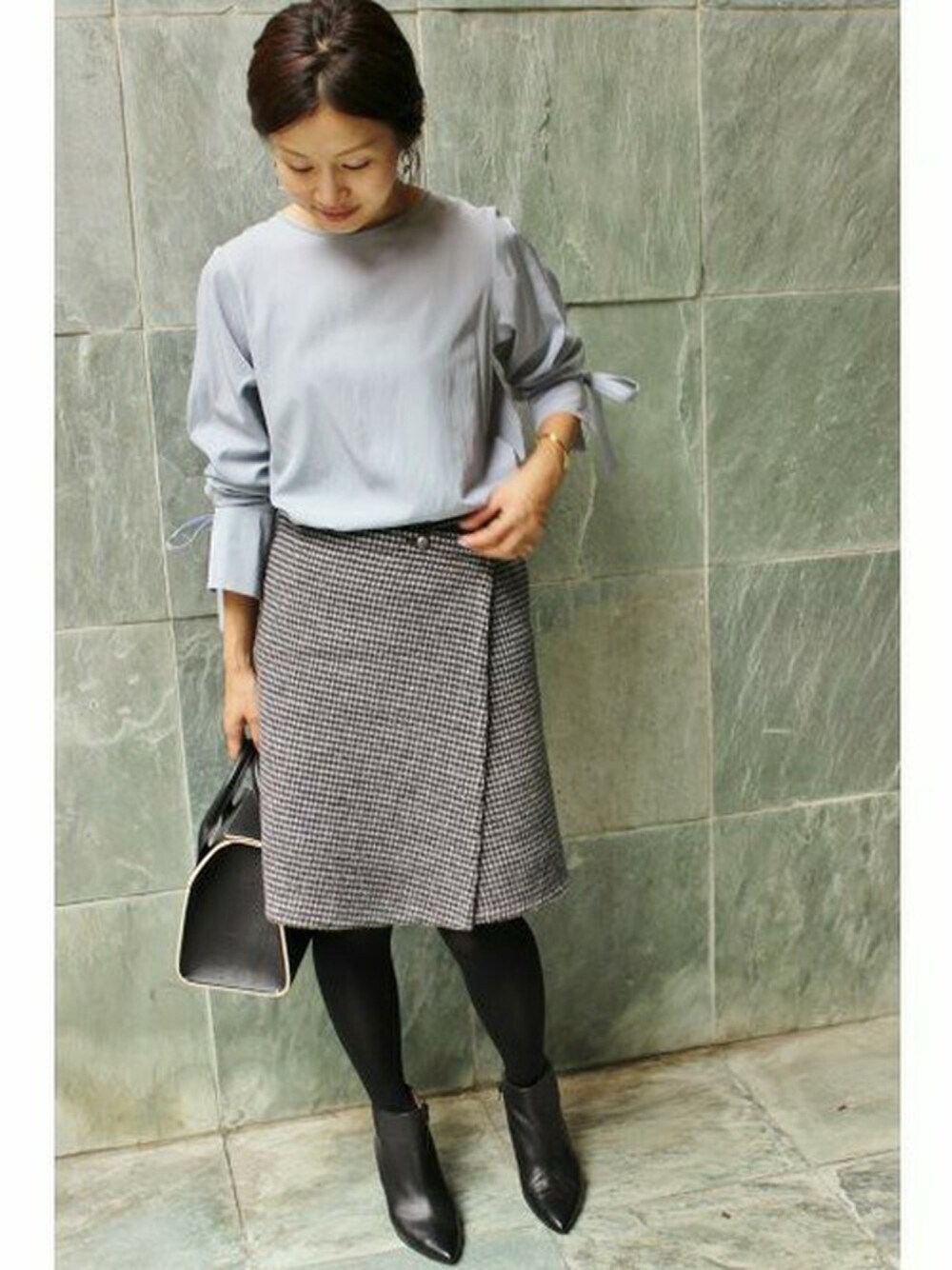 毎年人気のリバーシブルスカート。 今シーズンは早くも新色が登場。 淡いブルーのブラウスでやわらかい雰囲気に。