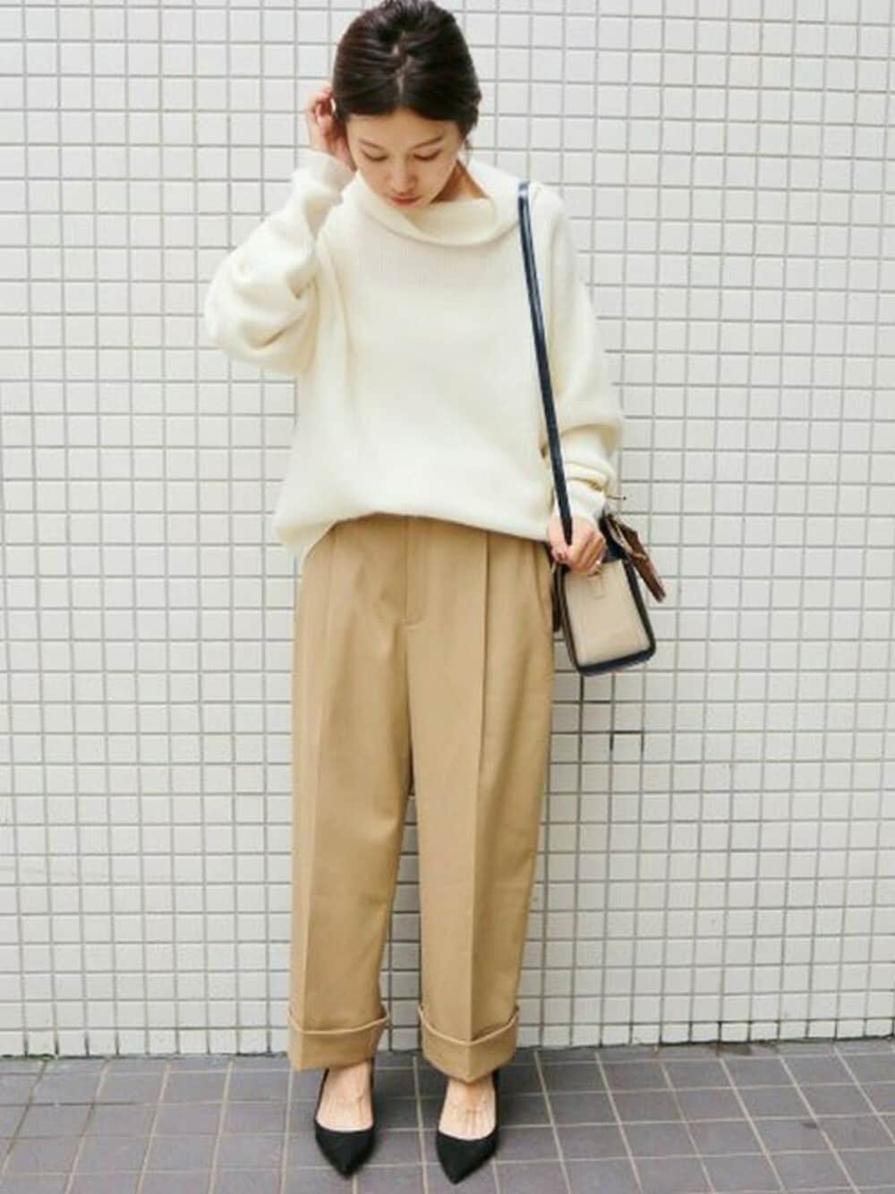 ふんわりきれいなホワイトニットで作るワントーンコーデ。 ダブルの裾のワイドパンツは少しだけくるぶしが覗く着丈でバランスよく着こなせますよ。