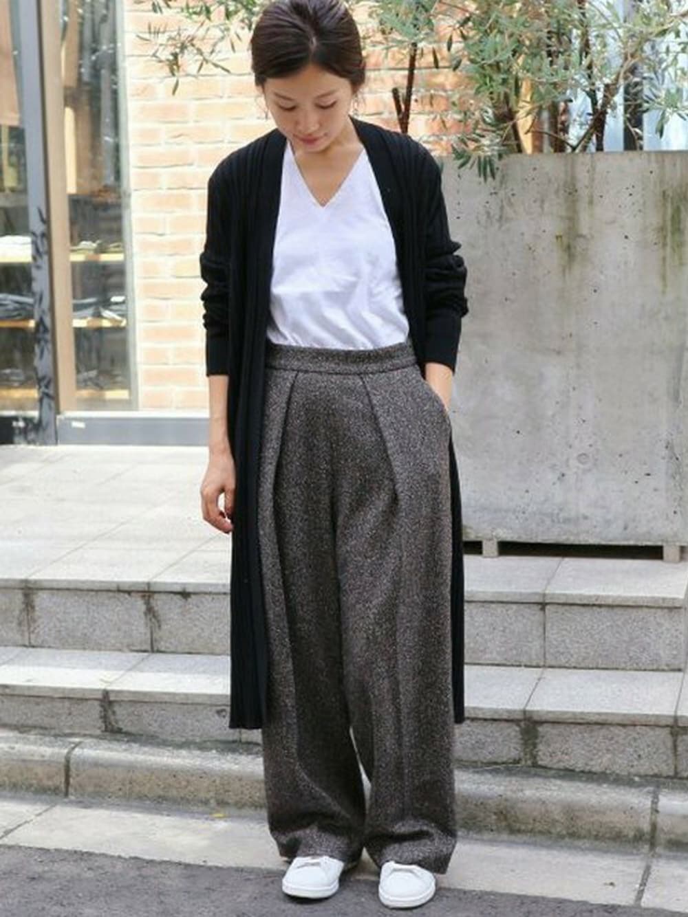 ロングカーデ×ワイドパンツ ゆるっとさせたIラインのコーディネート。 ワイドパンツはセンタープレスの入ったタックパンツだからすっきりと着こなせますよ。 足元はスニーカーでカジュアルに。