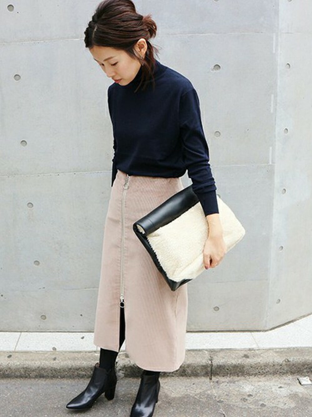 コーデュロイのデザインスカートを主役に、トップスはすっきりとしたタートルニット。 ファークラッチでアクセントをつけて。