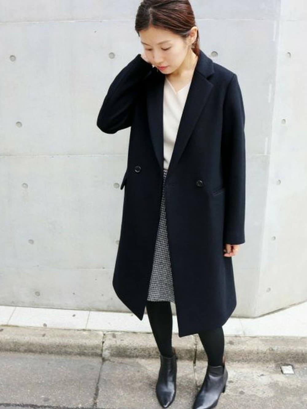 IENAらしいきれいめ定番コーディネート。 足元はブーティで冬らしいボリュームを出して。