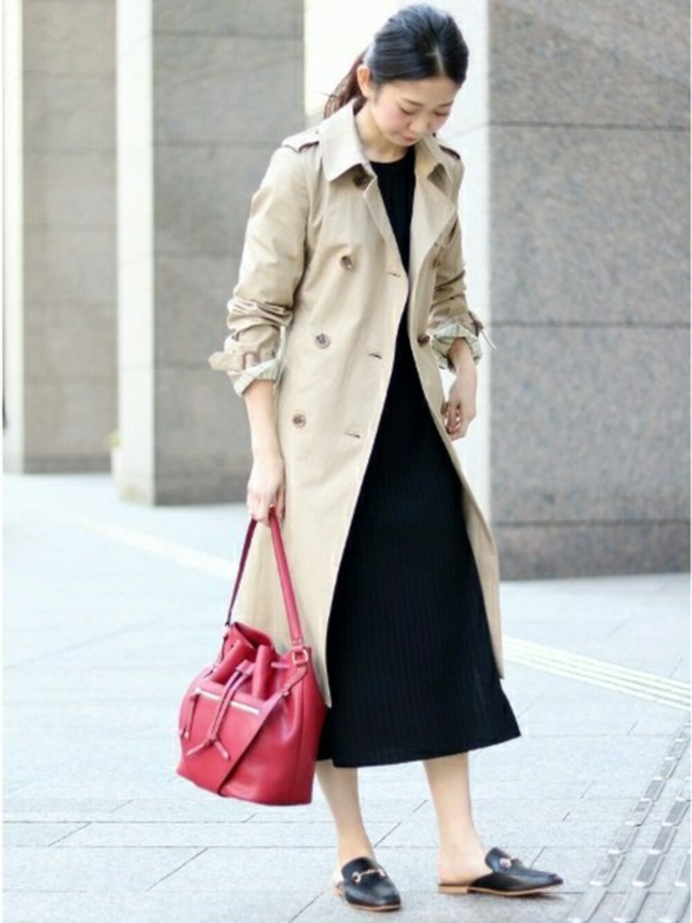 トレンチコートコーディネート。 シンプルな色使いのコーディネートにバッグで差し色を・・・♪ コーディネートがグッと引き締まります。 インナーには長めの丈のワンピースを合わせる事で縦のラインを強調。 足元にはスリッポンでルーズな印象に。