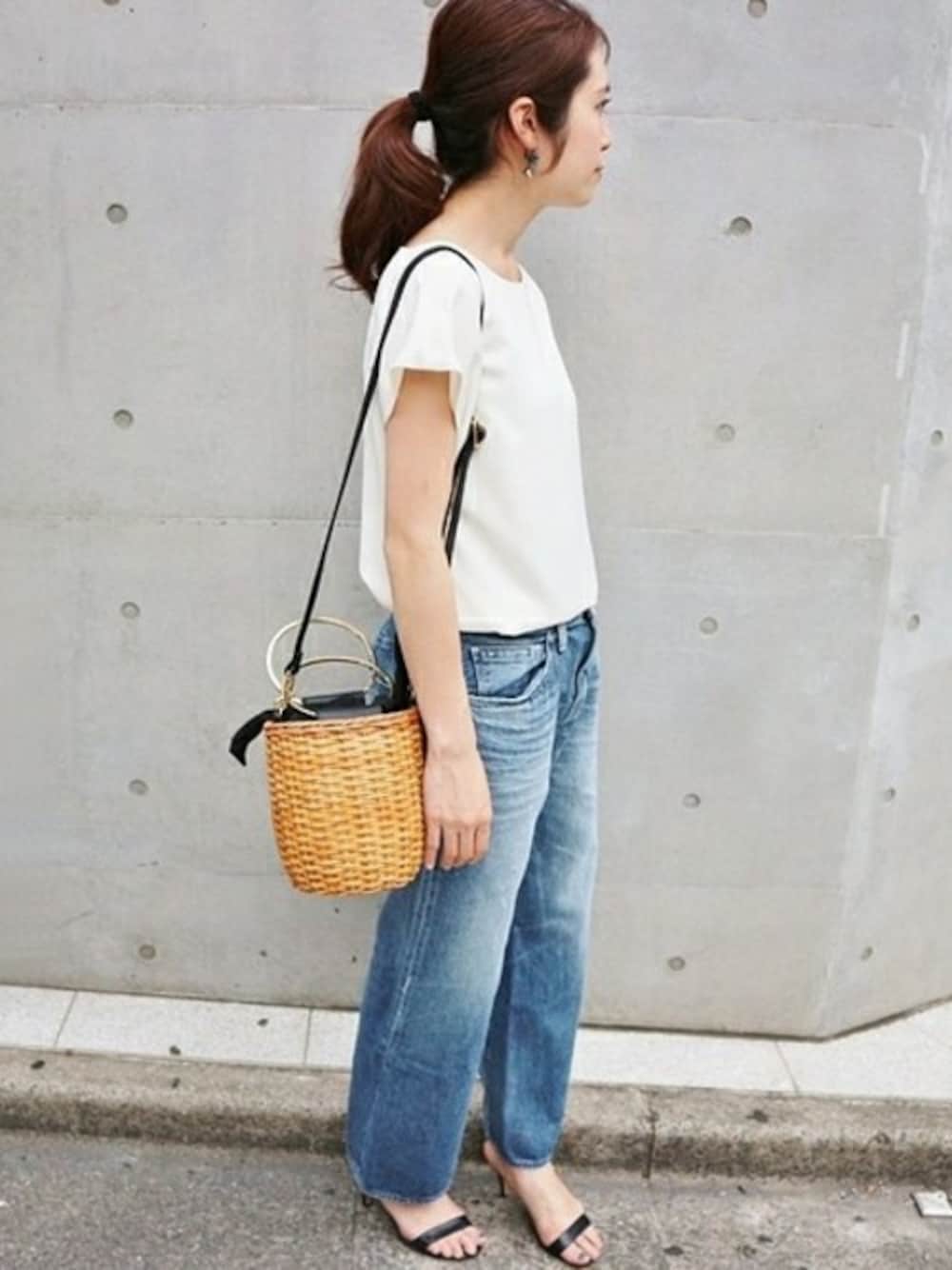 シルエットのきれいなデニムパンツは、シンプルなブラウスでさらっと大人カジュアルスタイルの完成!