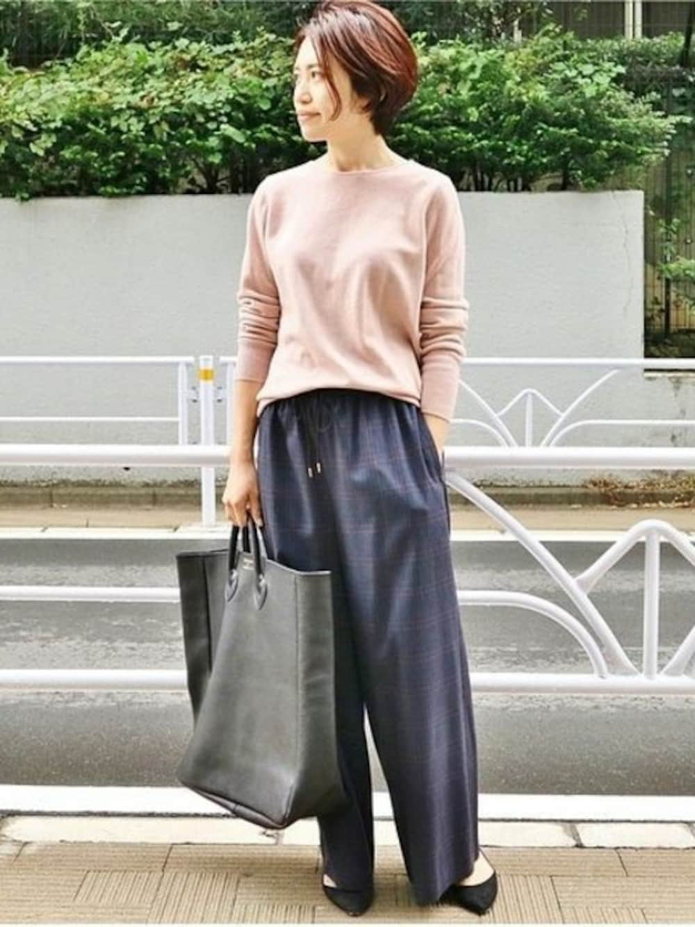 カシミヤ100%で仕立てたクルーネックプルオーバー。 コンパクトなシルエットでタックインもできるので、すっきりと着て頂けます。 ピンクの優しい色合いとチェック柄のパンツが女性らしさを引き立てます。