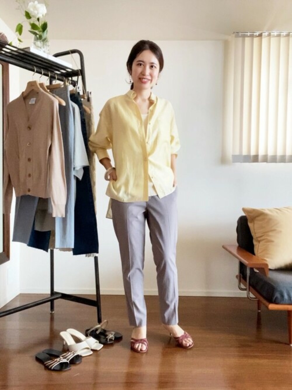 イエローのシャツの着回しコーディネート。 きれい目なベージュのパンツと合わせてオフィス仕様に。 足元にカラーを持ってきても、トップスと距離があるので浮いて見えず、洗練された印象に。