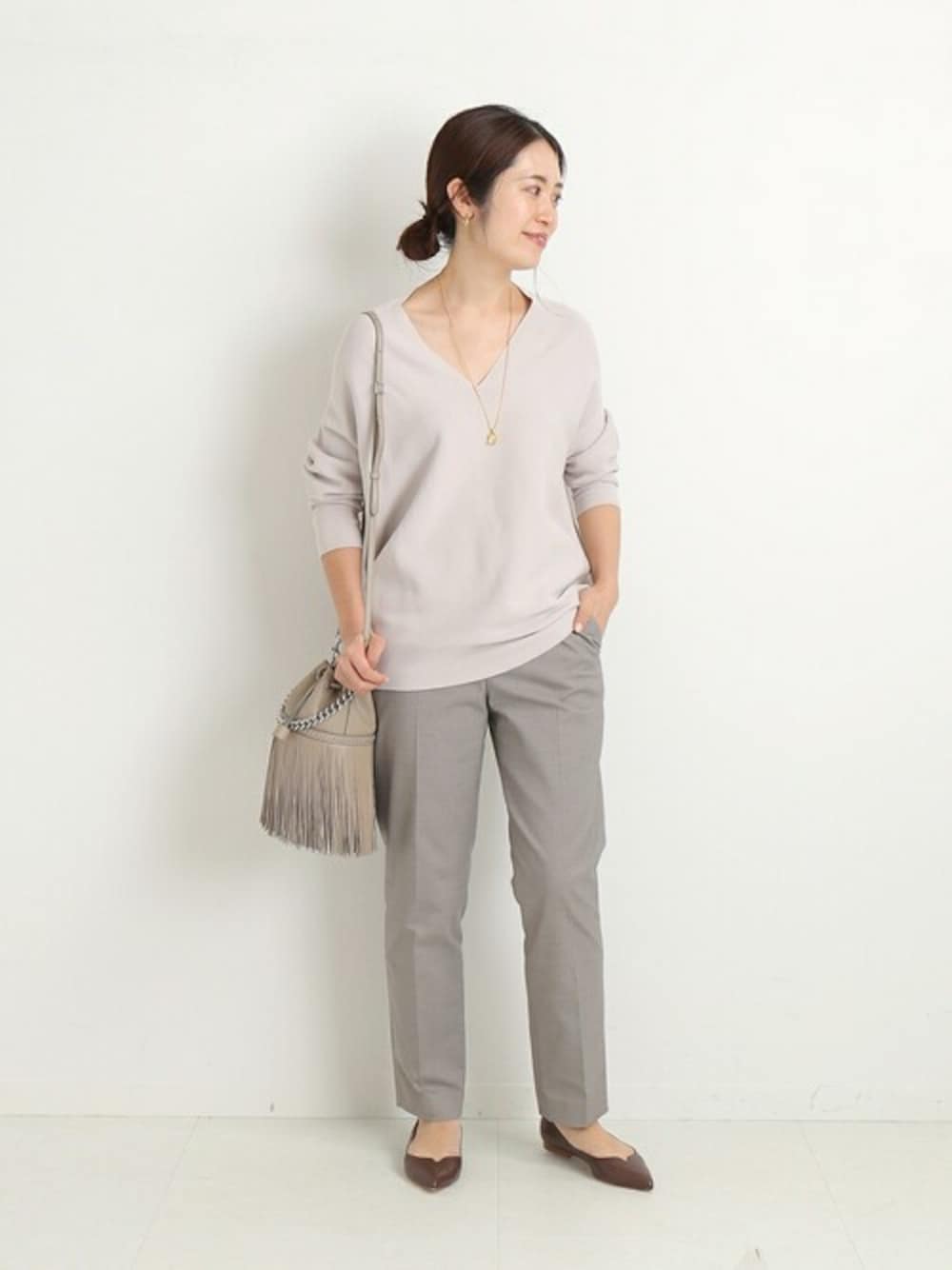 毎シーズン人気のコットンストレッチプルオーバーの袖付きが今年も登場! ニュアンスのあるナチュラルのカラーに、今年注目のグレーのパンツを合わせました。 ニュアンスカラーのコーディネートをボルドーのシューズで引き締めて。