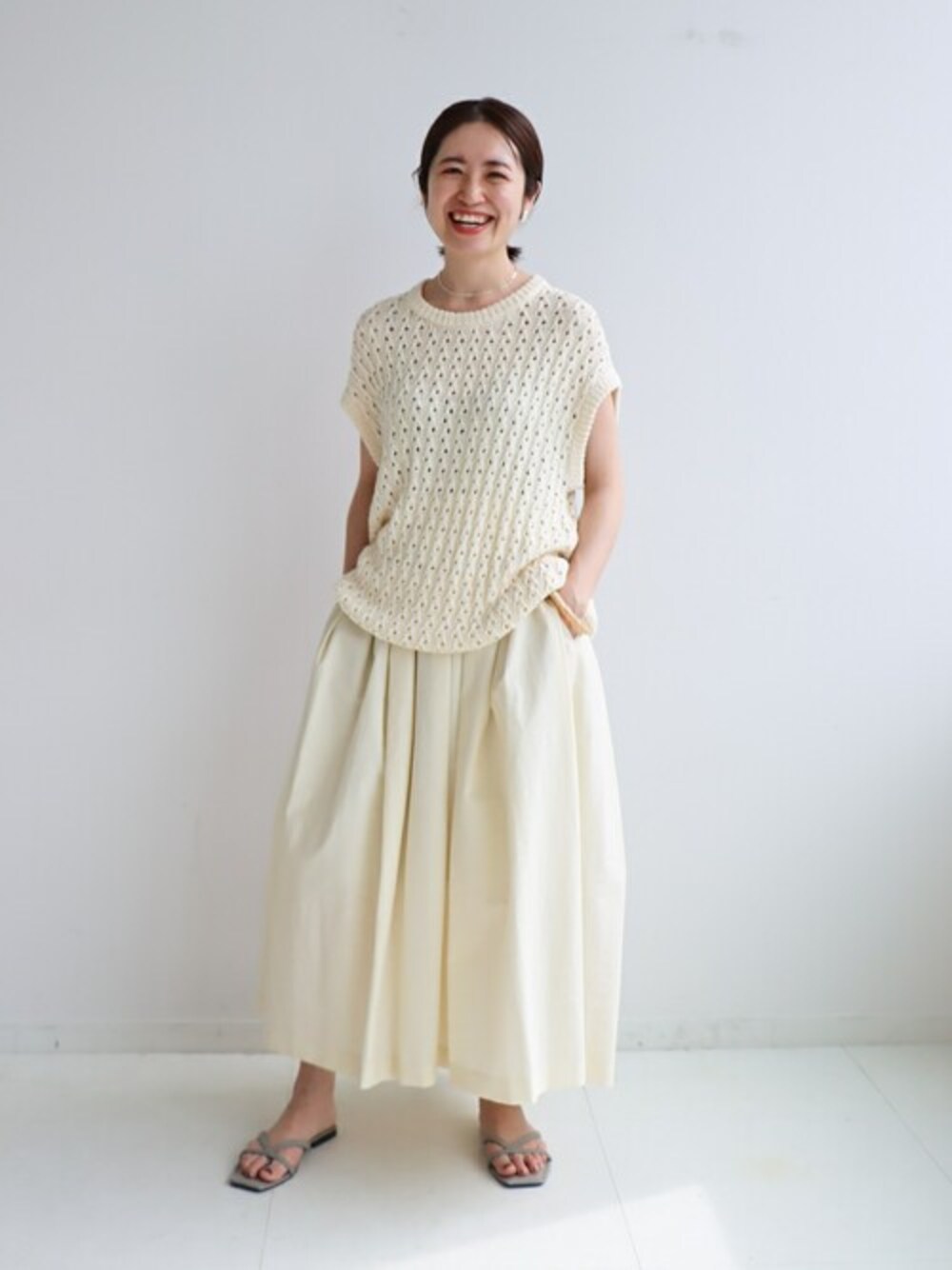 Knit(MAISON IÉNA collection)¥25,300 no.21080900722010 IENAでもはや定番となったこちらのスカート。 ボリュームがありながらも広がらないシルエットで大人なフレアスカートを楽しめます。 同系色でまとめたニュアンスコーデもおすすめ! サマーニットを合わせるのが大人顔に着こなすコツ。