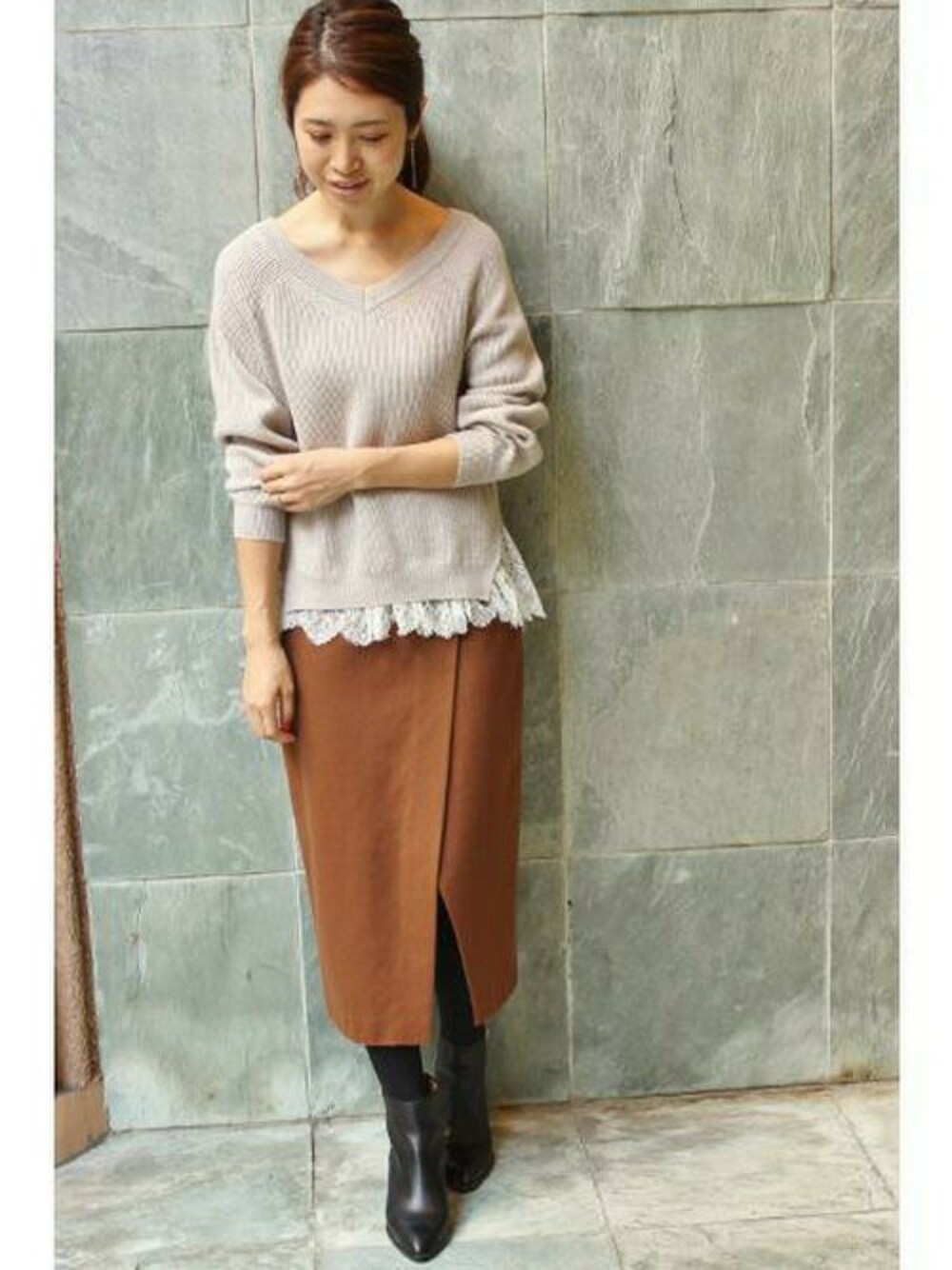 裾のレースとVネックが女性らしい雰囲気のニット。 ベージュ~キャメルのグラデーションでまとめたコーディネート。
