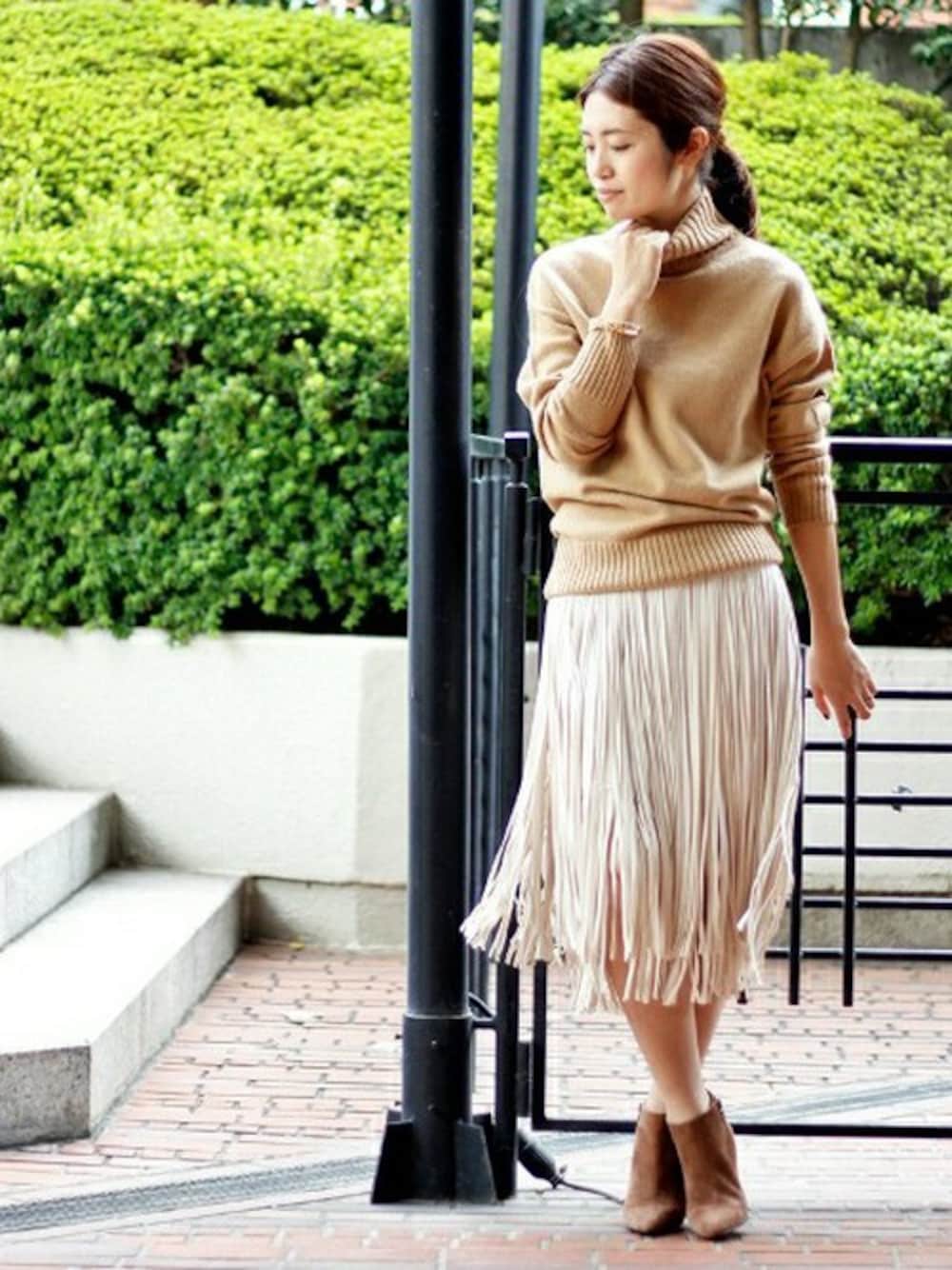今年一番のキャメル。 トレンドディティールのフリンジをとりいれたエレガントなスタイリング。 歩くたびにゆれるフリンジが、なんとも優雅。